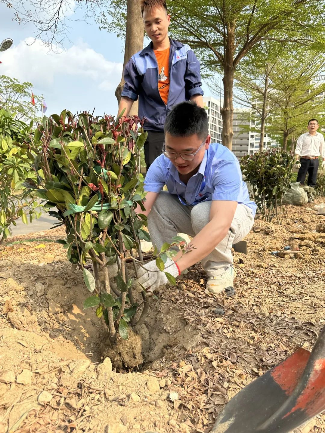 挥楸、浇水、定根,现场一派热闹的劳动景象。在支委的带领下,同志们分工协作,认真对待每一道工序,共栽下2000余棵叶石楠树苗。在汗水的浇灌下,一排排整齐的叶石楠挺立在春风里,焕发出新的生机与活力。
